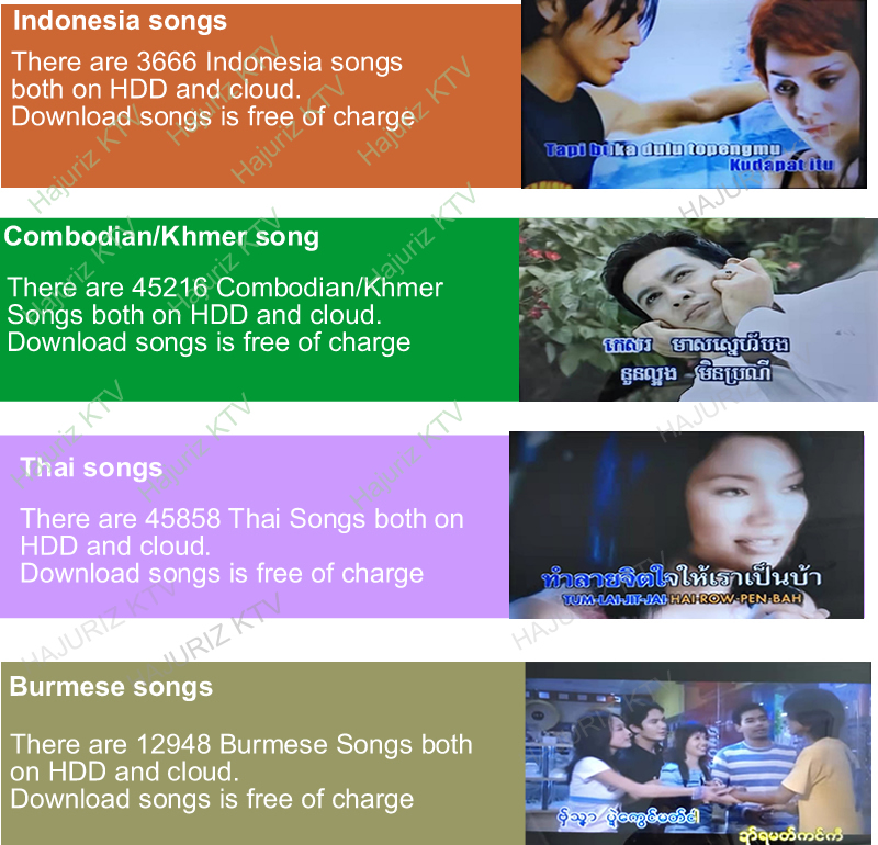 2.Download songs from cloud .There are more than 400K different language songs(Mandarin,Cantonese,Taiwanese,Vietnamese,English,Korean,Japanese,Thai,Burmese,Malay,Filipino,Spanish,etc. More than 10 kinds of songs on cloud ) on Cloud for download.The system updates songs each every week.It will hint Synchronize new updates cloud songs if there are new songs.
