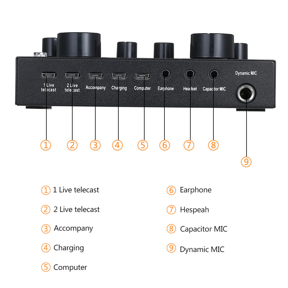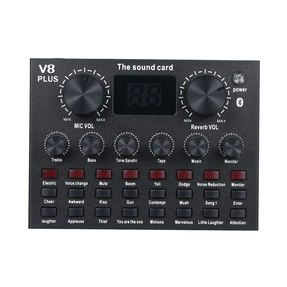 The live sound card contains 16 live effects, 12 electronic music effects, 4 sound field effects, 3 voice change. Digital display, one-key dodge, volume adjustable. It supports two phones live and one phone BT accompaniment meanwhile.