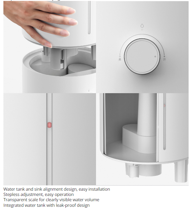 Main Features:Add water from above, easierSay goodbye to the traditional way of adding water from below, Mijia humidifier can add water directly from above. The separate design of the water tank makes adding water and cleaning more convenient.Sufficient amount of heavy fog, moisturizing all dayThe 4L large-capacity water tank is equivalent to 16 bottles of 250mL mineral water. 280mL/h strong fog volume, 10 square meters bedroom can humidify at least 9% in one hour, and relieve dryness faster. The longest humidification time can be up to 36 hours, and there is no need to add water frequently.Silver ion antibacterial material, humidification water source does not polluteThe main components of the water tank and the wading base use silver ion materials, which can effectively inhibit the growth of E. coli and Staphylococcus aureus, and the antibacterial rate can reach 99%.Light tone humidification, moisturizing does not disturbThe Mijia humidifier reduces the sound of large particles of water mist flowing and reduces fan noise, and the working sound does not exceed 38dB. The indicator light is soft and without halo, and it is not dazzling in the dark. Low noise, good sleep, comfortable sleep and moisturizing all night.Refuse to wet the table, the humidity is only in the airThe high-frequency ultrasonic atomizer vibrates 1.7 million times per second at high speed to break up water particles. The built-in baffle blocks the large particles of water, leaving only the fine water mist directly into the air through the oblique straight air duct, and the water mist is ≥50cm from the table.Large diameter designThe upper mouth of the Mijia humidifier has a diameter of 14cm, and the open mouth is easy to scrub. The sleek and delicate internal structure reduces the dead spots that hide dirt. The water tank is light and easy to lift, making cleaning more labor-saving.Double protection systemAfter the water tank is lifted, humidification is stopped. When the water source is exhausted, the machine does not dry and the orange indicator light reminds the lack of water. Double protection makes humidification safer.Stepless adjustment of the amount of fog, choose as you likeLow fog volume | Middle fog volume | High fog volumeSmall, it can be placed anywhereSmall space water storage boxReduce water storage, reduce bacteria breeding environment, humidify safe and cleanWaterproof membrane grooveBalance the air pressure of the water tank to prevent the machine from stopping workingUltrasonic welding technologyImprove product tightness and reduce the possibility of bacterial survivalSemi-closed air inlet gridReduce the possibility of internal moisture and extend product lifeNote:CN power charger charging, delivery needs to match the corresponding country adapterParameters:Rated voltage: 220V, 50HzRated power: 17.5WNoise: ≤38dBCaliber: 14cm