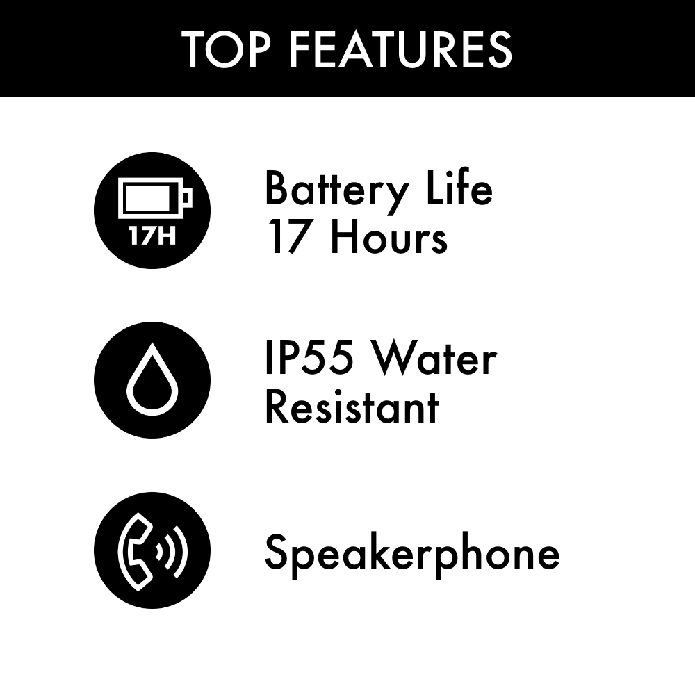 A portable Bluetooth speaker needs impressive battery life. This one delivers. The rechargeable lithium-ion battery plays up to 17 hours — for full-day listening. Sure, some other speakers may play longer, but not without compromising the deep, powerful bass you’ll get from ours.