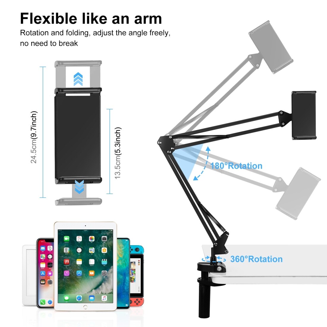 Features :✅1. Folding type, free adjusting height and 180 degree or 360-degree adjustable, comfort to pull and draw.✅2. Made of metal material, this stand is strong and durable for using✅3. Dual suspension springs on each boom arm, protects your phones or tablet PC from suddenly dropping.✅4. Flexible mount holder can be bent and folded freely, so as to easily view your device at any angle.✅5. The base clamp will be compatible with any different thicknesses table/platform. It enables you to release your hands, which is very practical lazy mount holder.