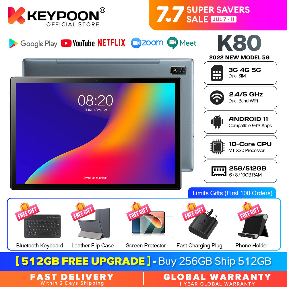 BRAND PROMOTION: 【Buy 256GB Ship 512GB】- Customer just need to order 8GB+256GB variant, then seller will auto ship 10GB+512GB without paying price difference. Limited Quantity Offer 100pcs for sales ONLY!!! WARRANTY: 【1 Year International Warranty】- Comes with KEYPOON Official warranty card. We support 1 year free item warranty, in case the item getting any issue without non-aritificial damages, we can repair and even give 1to1 exchange new item. PRODUCT FEATURE: 【SUPERIOR WATCHING EXPERIENCE】KEYPOON K80 Tablet is powered by 10-Core Processor. 2022 upgraded Android 11 tablet provides + 40% faster processing speed than regular Quad-Core. 10.1-inch Tablet screen size with 1920x1200 resolution support, perfect for home entertainment and office. DUAL-BAND WI-FI】The 2022 KEYPOON K80 Built-in Dual-band wifi module, Support 2.4/5Ghz wifi, the faster wifi you get, the more stable wifi for your smoother watching movie experience. 【DUAL-SIM】The 2022 KEYPOON K80 Tablet support dual SIM feature, support 3G/4G/5G netowrk, and also support phone call feature. All-in-One Tablet that make your life experience be more easier and convenient. 【BIGGER THAN BIGGER】The tablet has 8GB RAM, 256GB/512GB internal storage. The GMS Certified latest Android Tablet, with basic Google apps already on and without bloatware. Get rid of unexpected ads and download apps from Google Play, such as SKYGO, NetFlix, YouTube and more. 【LONG LASTING BATTERY】Equipped with a long-lasting and environmentally compliant 8800 mAh battery, this 10-inch tablet will effortlessly provide you with up to 8 hours of support for reading, browsing, watching movies and playing games. The long-lasting battery life and lightweight design allow you to enjoy your tablet anywhere, anytime. 【DUAL CAMERAS AND SPEAKERS】With front 5 MP & Rear 13 MP dual cameras, which would bring your excellent photos and clear video chats. Dual speakers are designed to provide high-quality and powerful sound for your favorite music, games and videos. SPECIFICATIONS: Model: KEYPOON K80 (2022) CPU: X30 10-Core System: Android 11 (System Upgradable) Screen Size: 10.1 Inches IPS Screen Screen Resolution: 1920 * 1200 WiFi: Dual Band 2.4G/5Ghz WiFi Bluetooth: BT 4.0 Battery: 8800mAh Li-on Battery Camera: Front 5MP + Rear 13MP Speaker: Dual Stereo Speaker RAM: 6GB/8GB/10GB ROM: 128GB/256GB/512GB Cellular: 3G/4G/5G DUAL SIM Charging Port: Type C WHAT'S IN THE BOX: 1 * Tablet PC 1 * User Manual 1 * Type C Cable 1 * SIM Card Pin 1 * Official Warranty Card SPECIAL FREE FITS: 1 * Leather Flip Case (Limited Gifts) 1 * Bluetooth Keyboard (Limited Gifts) 1 * Tempered Glass Screen Protector (Limited Gifts) 1 * OTG Converter (Limited Gifts)