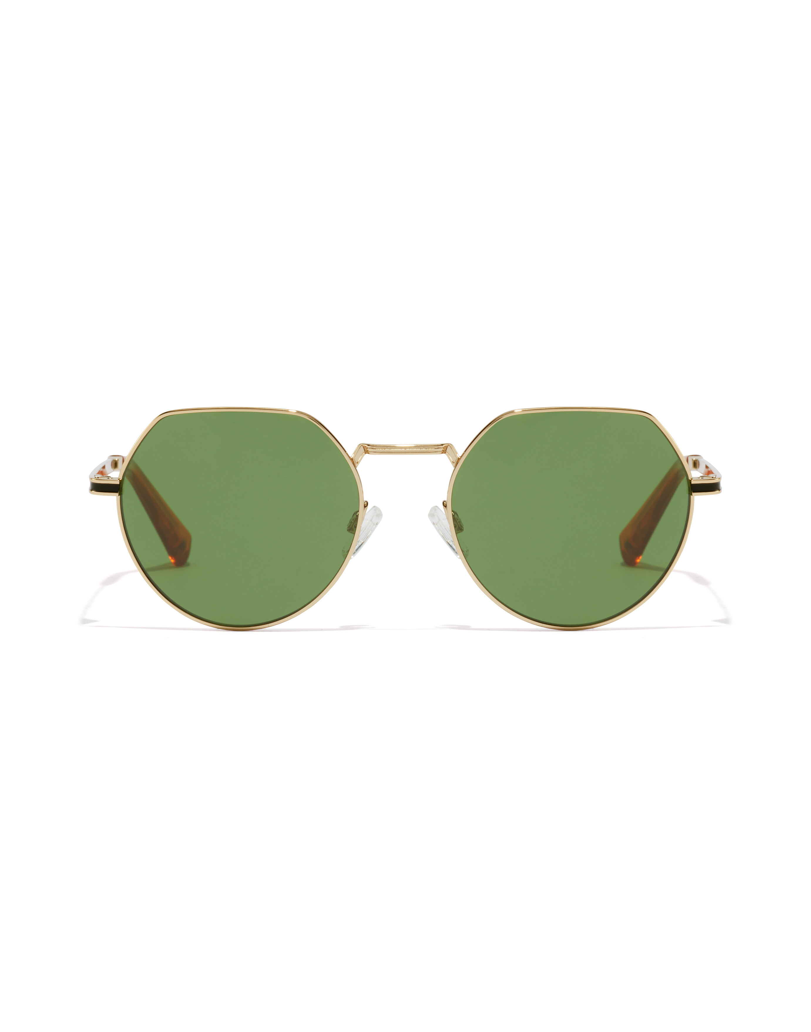 The angular upper rims, and rounded lower rims on these gold stainless steel sunglasses with bottle green lens impart a subtly asymmetrical effect. The striated bridge is also angular, and matt black inlays along the temples lead to a transparent orange-caramel eartips.