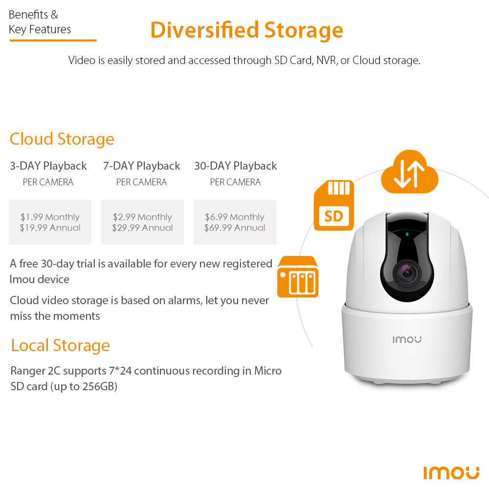 Video is securely stored and accessed through SD card, NVR, or cloud storage