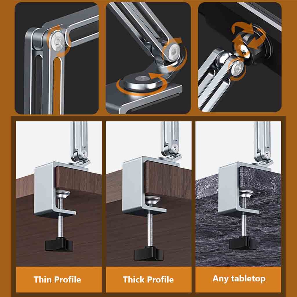 --------------------------------------------------- Ship from Singapore Locally ️ All ready-stock products in Singapore J&T Express Delivery (With Tracking) All Order will be dispatch out with 24Hrs From Monday - Saturday Except for Sunday & Public Holiday --------------------------------------------------- Product Description: 1. Multi-joint adjustable, Height/angle freely adjustment 2. Full aluminium alloy material for base and arm, Match with the MAC surface 3. Max loading 1KG, Stable without shaking 4. 360° rotation screw structure base, Support clamping desk thickness 0-64mm 5. Wide compatibility, Fit for Cell phones and tablet pc from 4 inches to 13 inches. Product Specification: Material: Aluminium Alloy and Silicone Gel Product Colour: Grey/Silver Product Size: 65.8 x 16.6 x 6.6cm Product Weight: 0.47 kg What's in the package? - 1x Holder Clamp 3 Months Local Warranty *Terms and conditions applied *