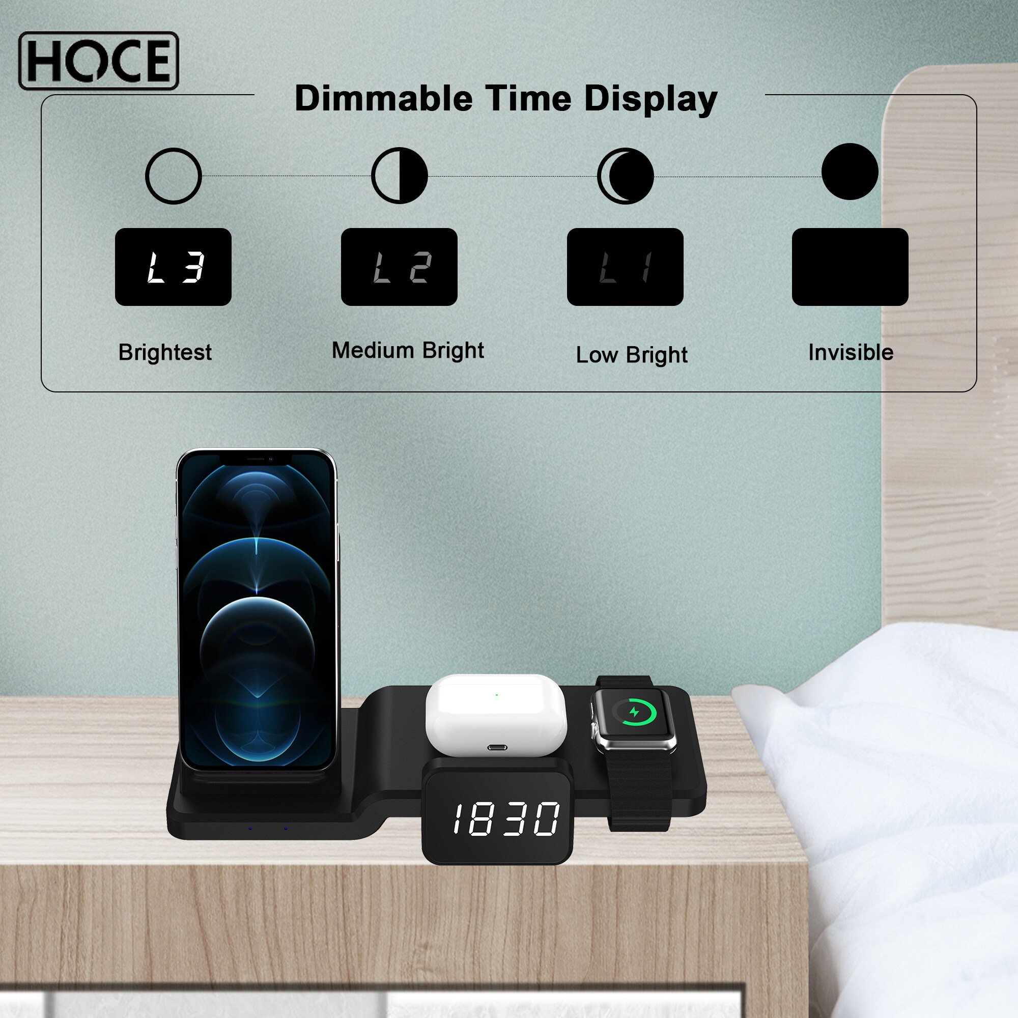 HOCE 5 in 1 Wireless Charger Fast Charging Dock Station with Clock Time Display For iPhone AirPods iWatch 6 SE Wireless Charger Stand