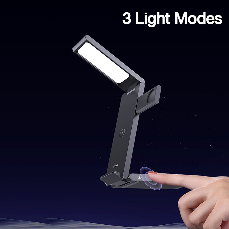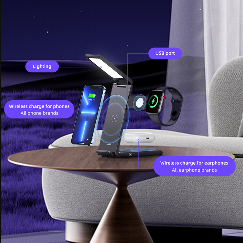 USAMS 4 in 1 Wireless Charging Stand 15W Fast Charger Folding Design With Table Lamp For Phone/i-Watch/Air-Pods Charging