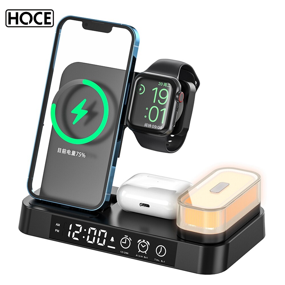HOCE 30W 3 in 1 Qi Wireless Charger For iPhone 14 13 12 11 Pro Max XR XS X Apple Watch 7 6 5 4 3 2 SE Alarm Clock Fast Charging Station With LED Light For Airpods Pro 3