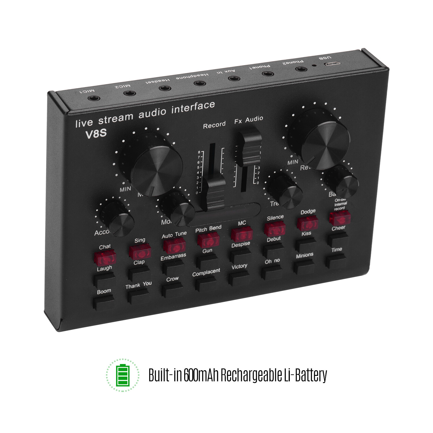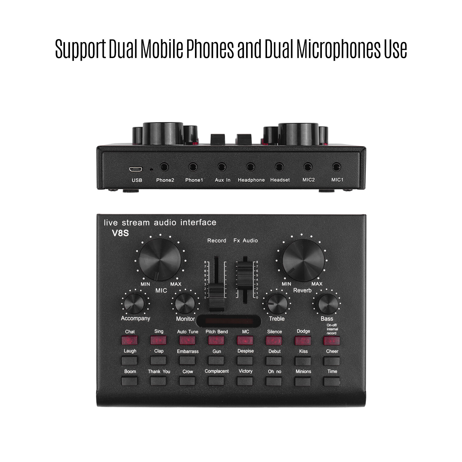 This product is a USB audio interface sound card that integrates functions of recording, Karaoke, live streaming and computer audio playback.