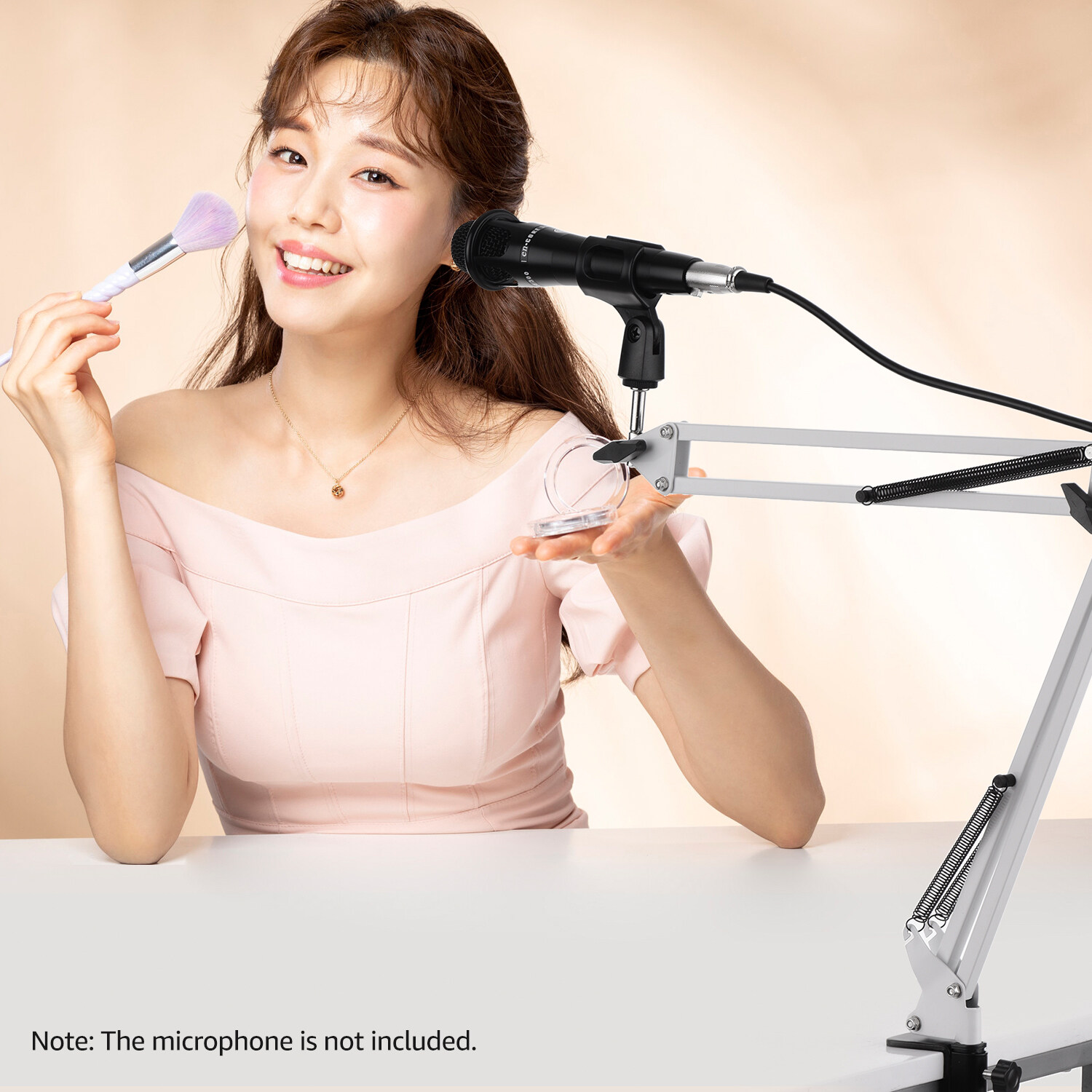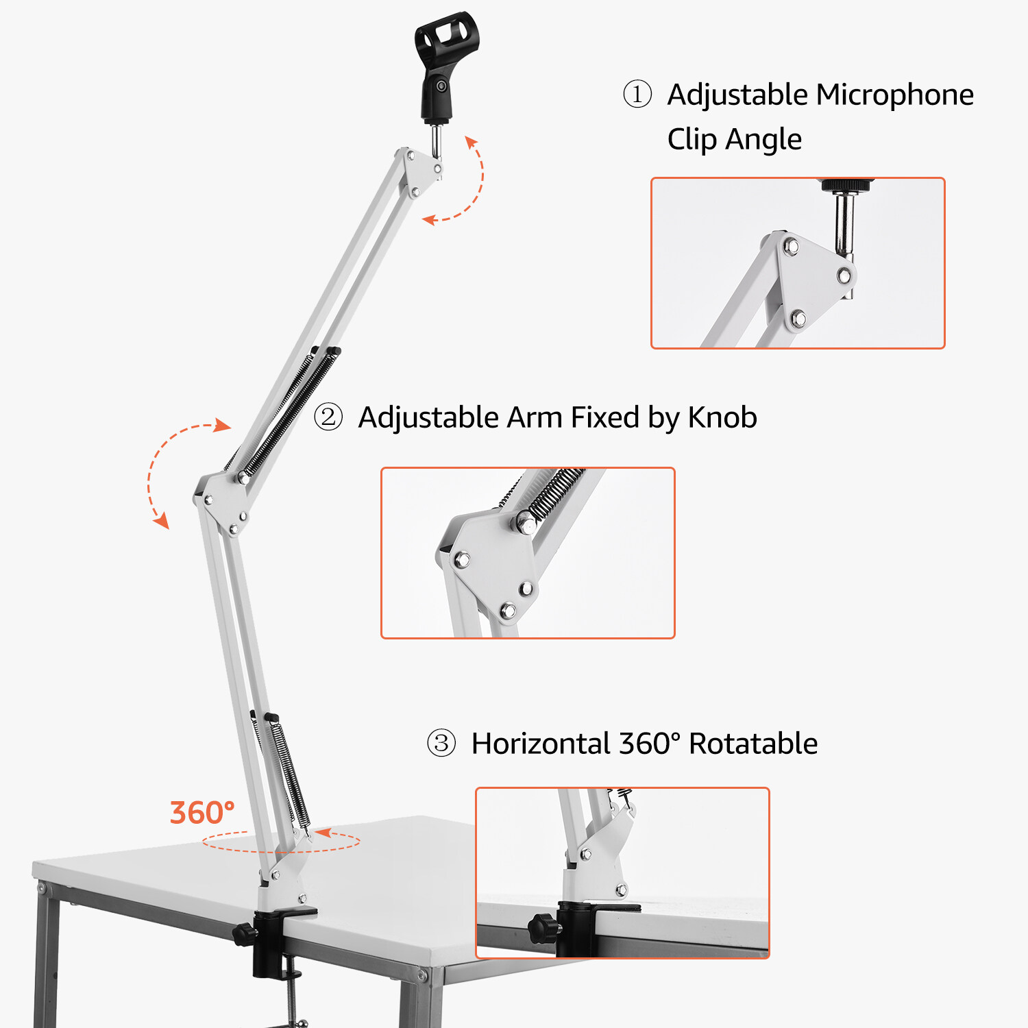 The microphone stand is designed for microphone mounting on table via the mount adapter clipping the edge of desk, as the maximum clamping distance is 5.5cm.