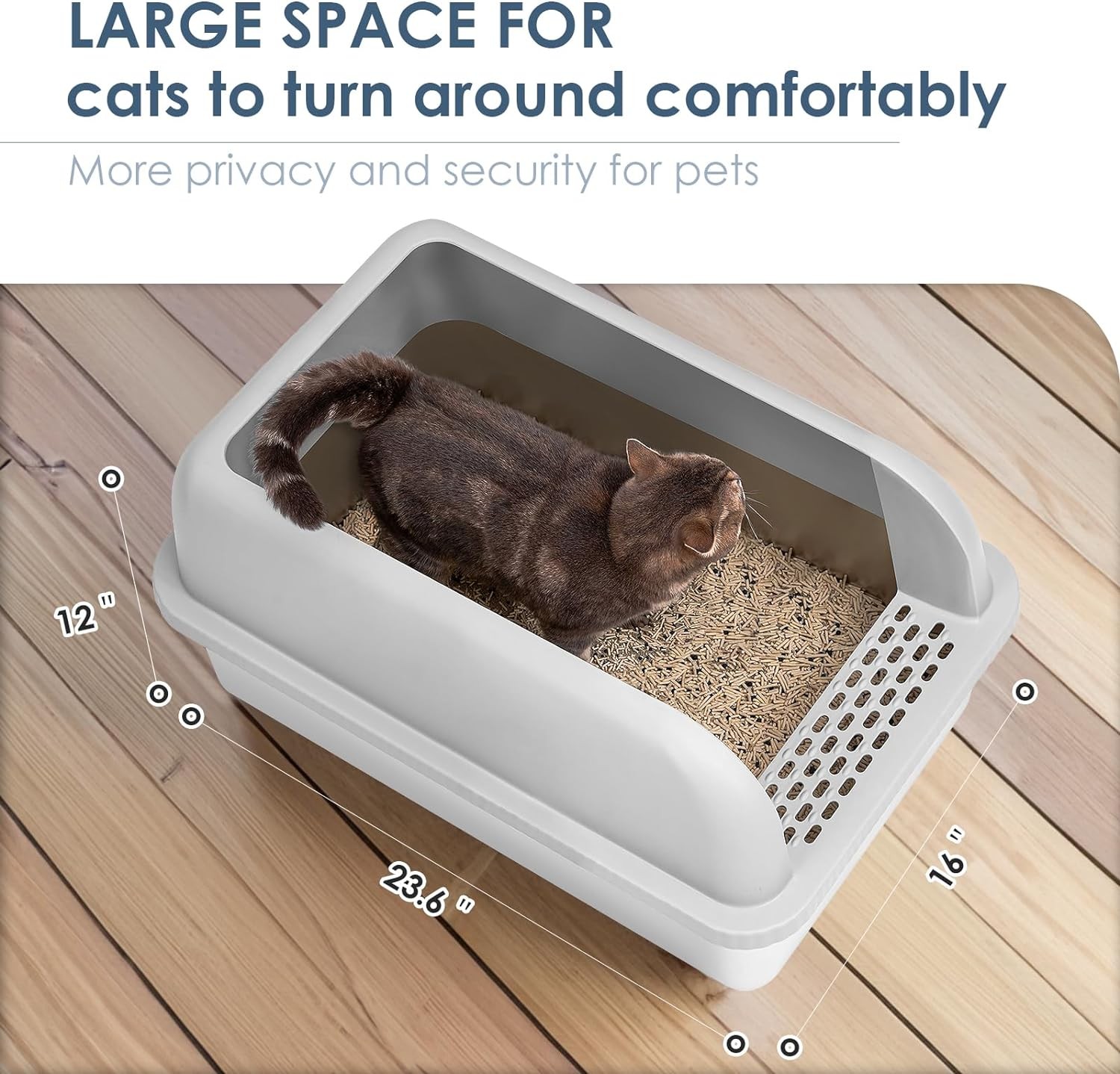 • Extra Large Stainless Steel Litter Box for Big Cats or Multiples - The XL litter pan is 23.6" long by 16" wide. Special Design of 12" high sided litter box with wrapping around the corners is ideal for big cats, preventing cats from splashing litter outside the pans and allow for privacy. Roomy Space offer cats to comfortably move around while doing their business.